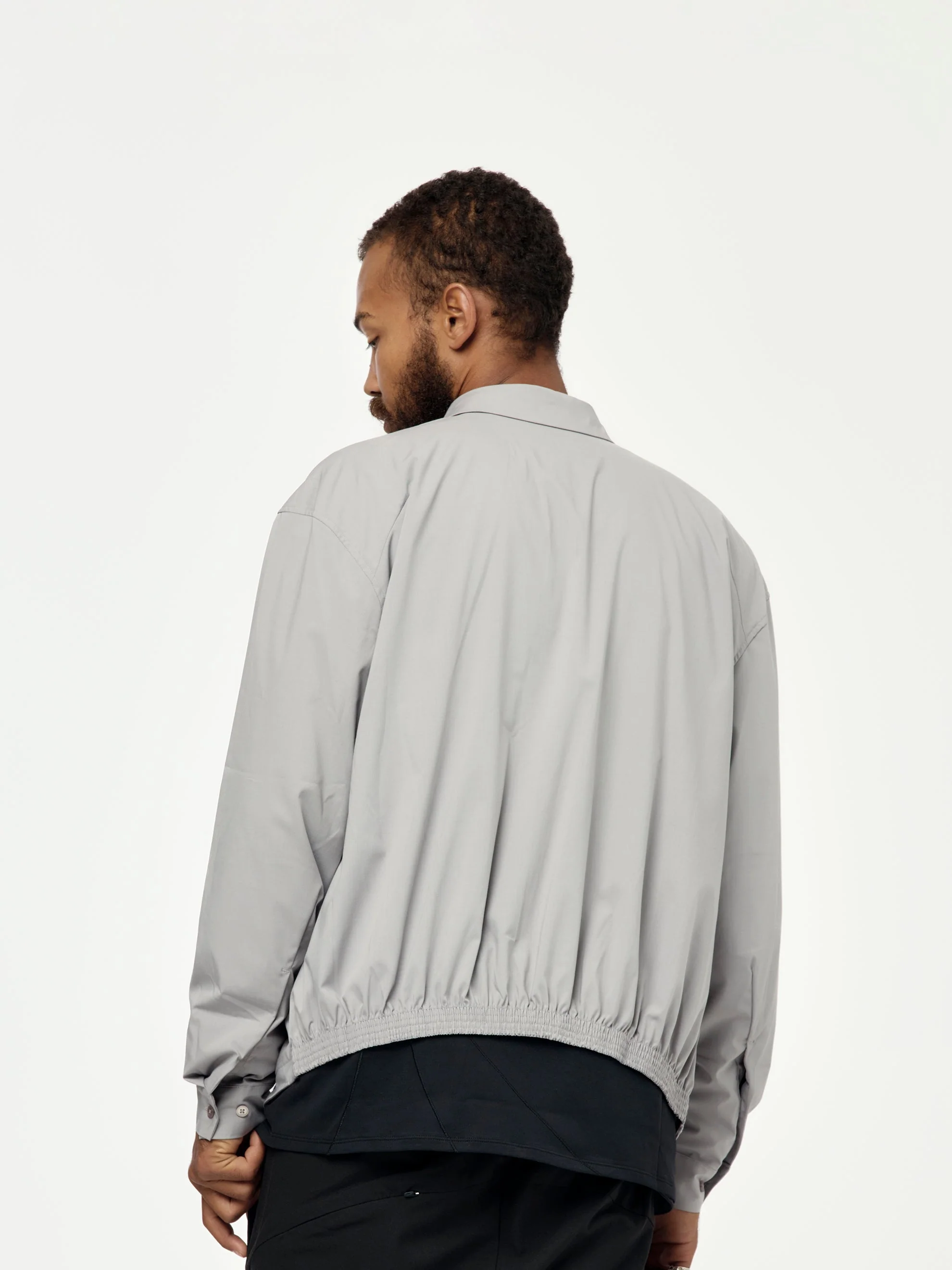 Redefinition of a classic shirt with elastic band detail on the back to create a blouson-like silhouette. Subtle transition between the front and back panel, forming a narrowing outline on the side. Arched line stitches and dart detail on the shoulder enables the shirt to sit naturally on one‘s body, allowing comfort movement.