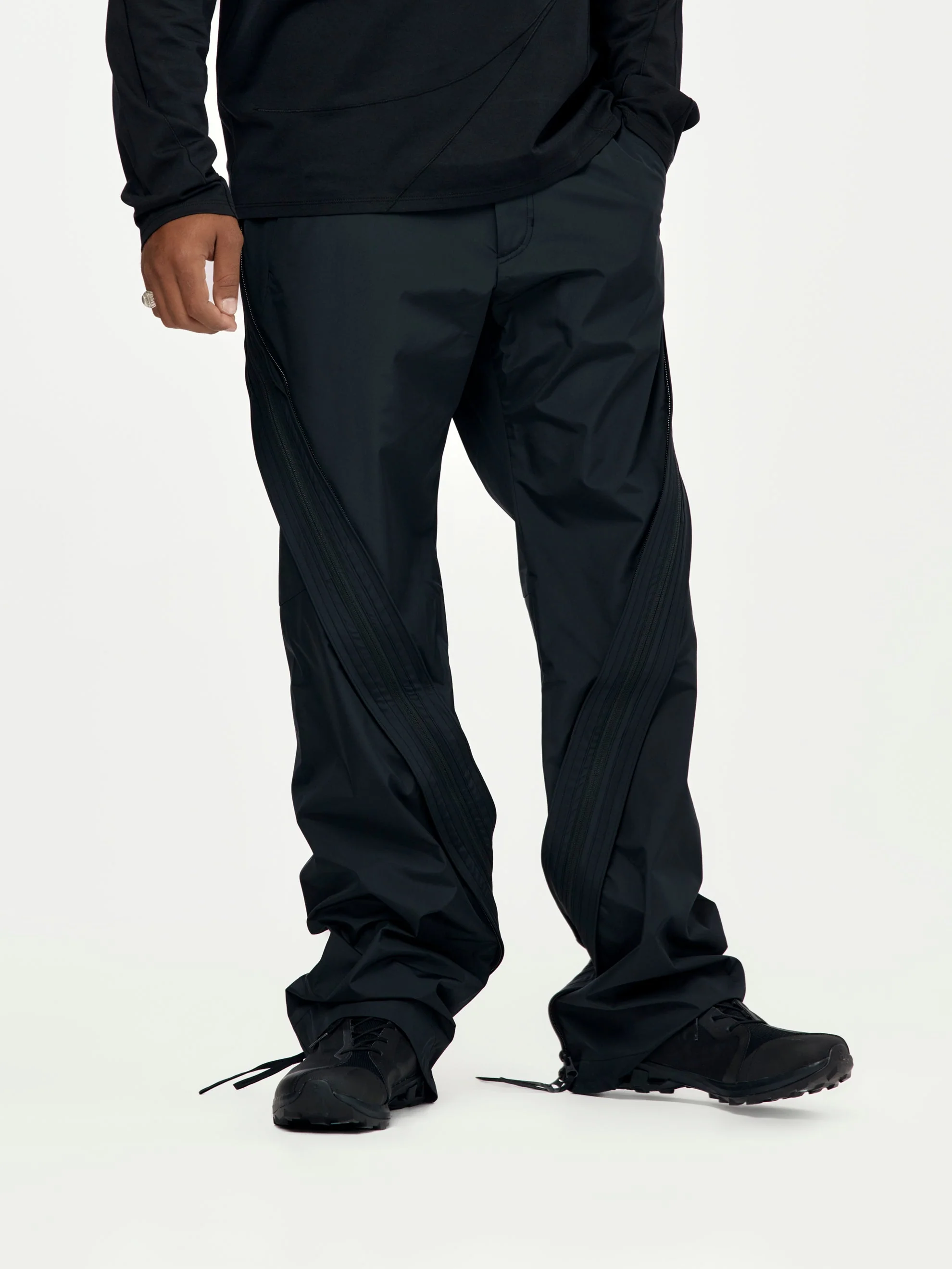 Based on 4.0 TECHNICAL PANTS CENTER, with revised fabric. The 2-way zippers create an asymmetric line design from waist to hem, while offering various styling options by adjusting the size and fit of the garment.