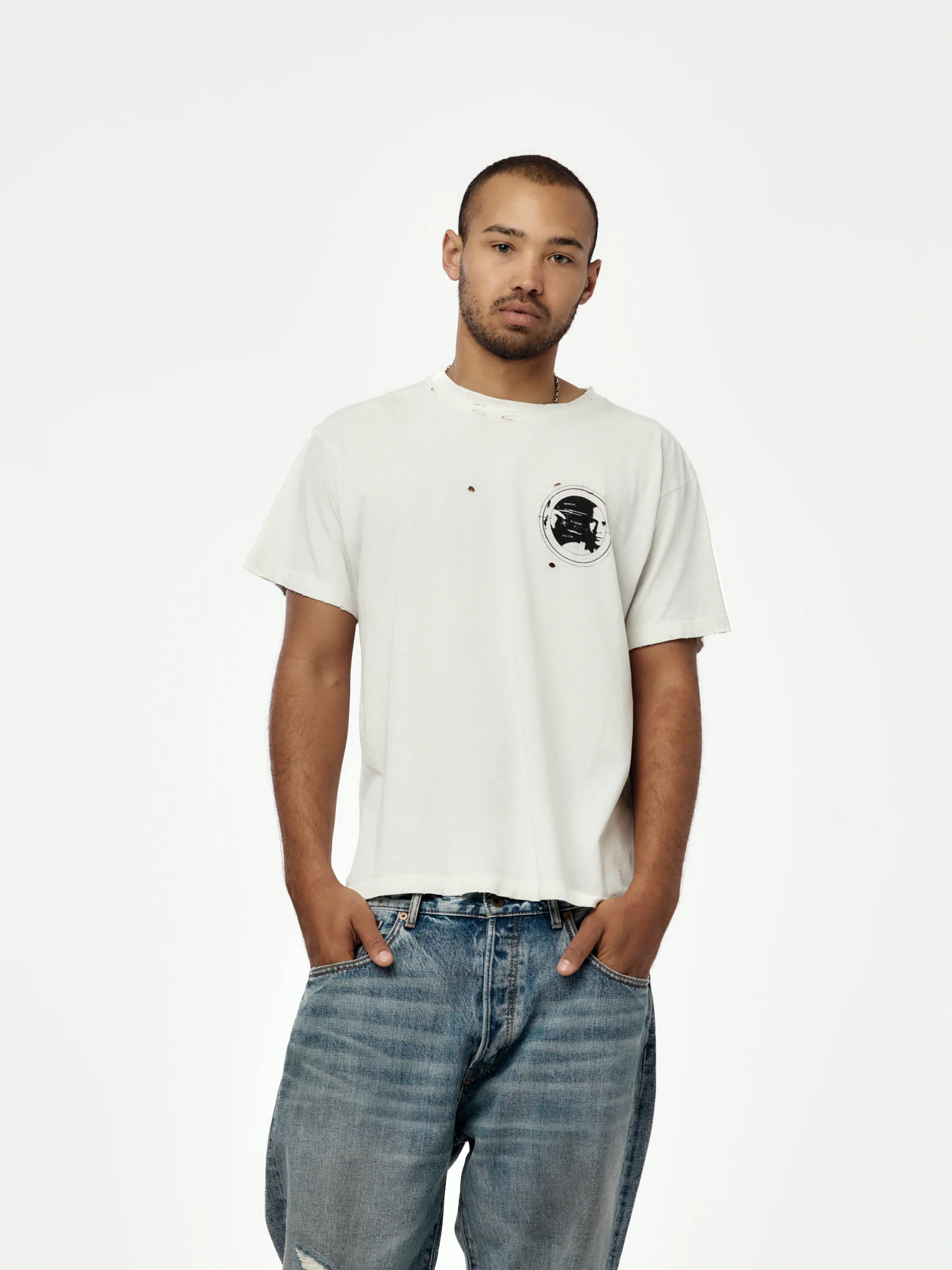 The Coyote Tee features a faded white wash and symbolic graphic work inspired by survival, instinct, and myth. Crafted from premium cotton, the tee delivers a worn-in texture that aligns with De La Tombe’s punk-meets-art approach.
