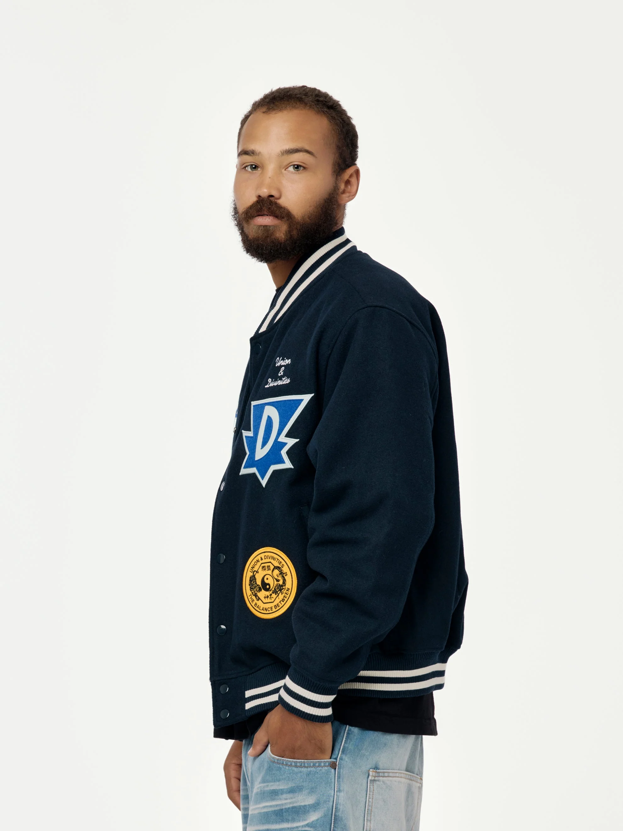 This Divinities x Union Varsity Jacket in Navy boasts premium quality and unique style. The jacket features eye-catching patches, adding a touch of individuality to the classic varsity design. Stay comfortable and fashionable with this must-have piece from Divinities and Union collaboration.