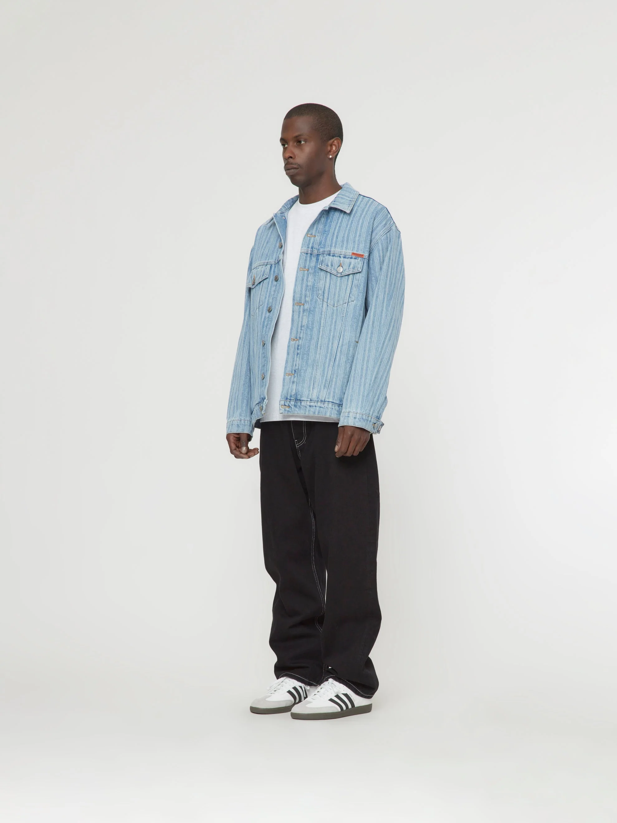 The classic Martine Rose oversized denim jacket reimagined in a tonal blue "expect perfection" lasered stripe for AW23. Featuring a fold down collar, front button closure, stitched in darts at the front and back for shaping, adjustable waist tabs, button cuffs and stitched Martine Rose branded label in contrasting orange.