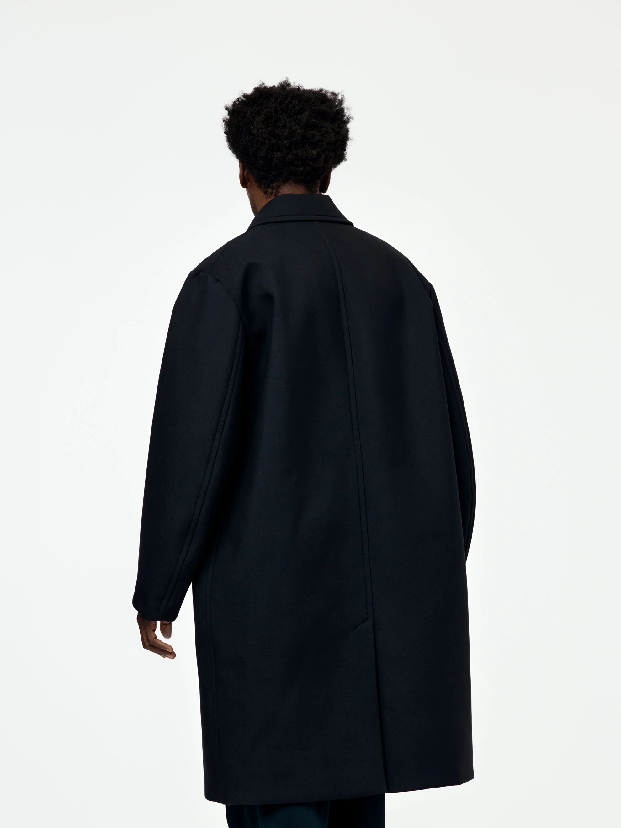 A long, oversized coat in rich dark navy with minimal fastenings and generous drop-shoulders. Designed for layering, with a soft structure and tonal lining. Timeless outerwear, updated with ease.