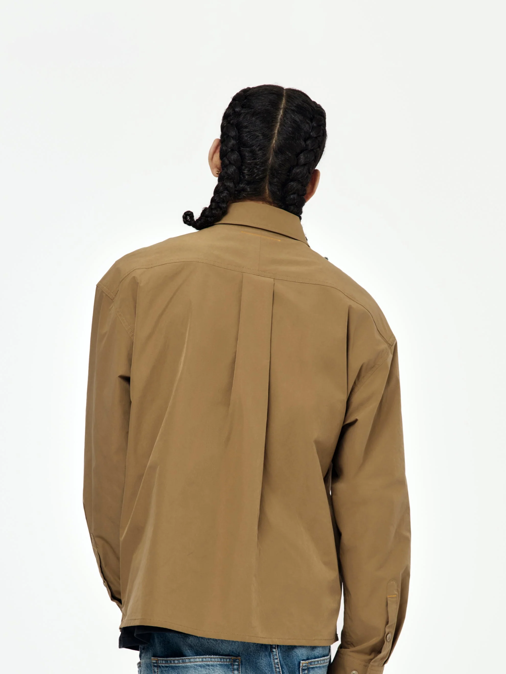 Relaxed long sleeve shirt. Two front pockets. Front button closure.