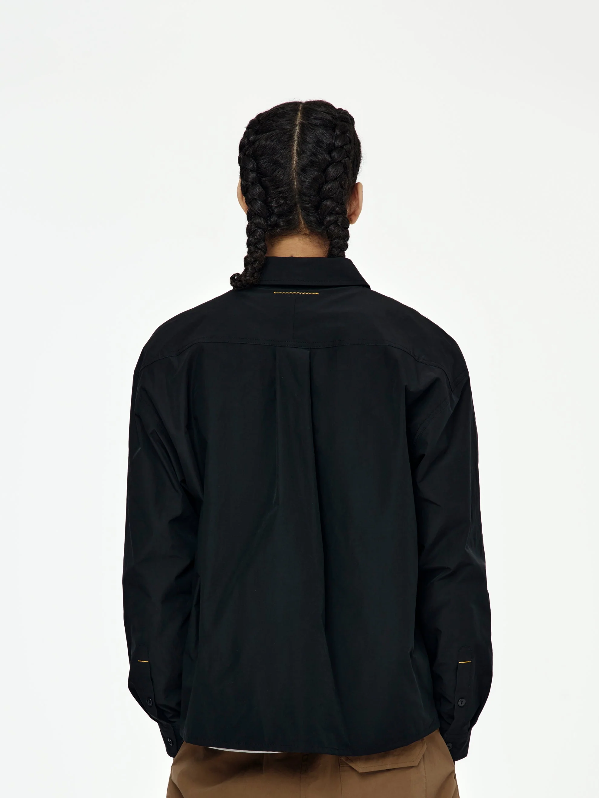 Relaxed long sleeve shirt. Two front pockets. Front button closure.