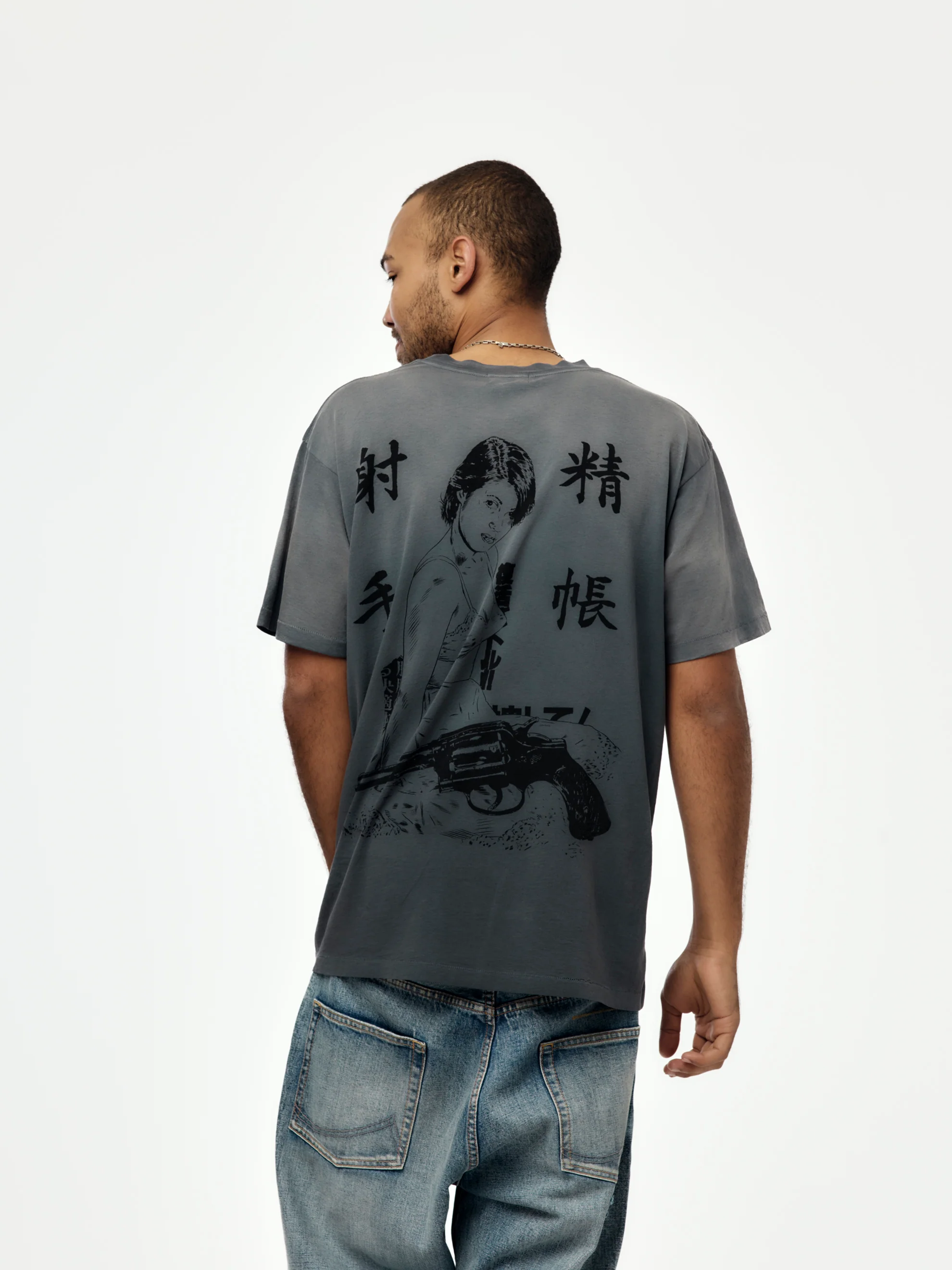Finished in dirty grey, the Sugar Pistol Tee balances softness and edge. Graphic-driven and intentionally distressed, the design reflects De La Tombe’s collision of beauty and violence—raw, expressive, and unapologetically underground.
